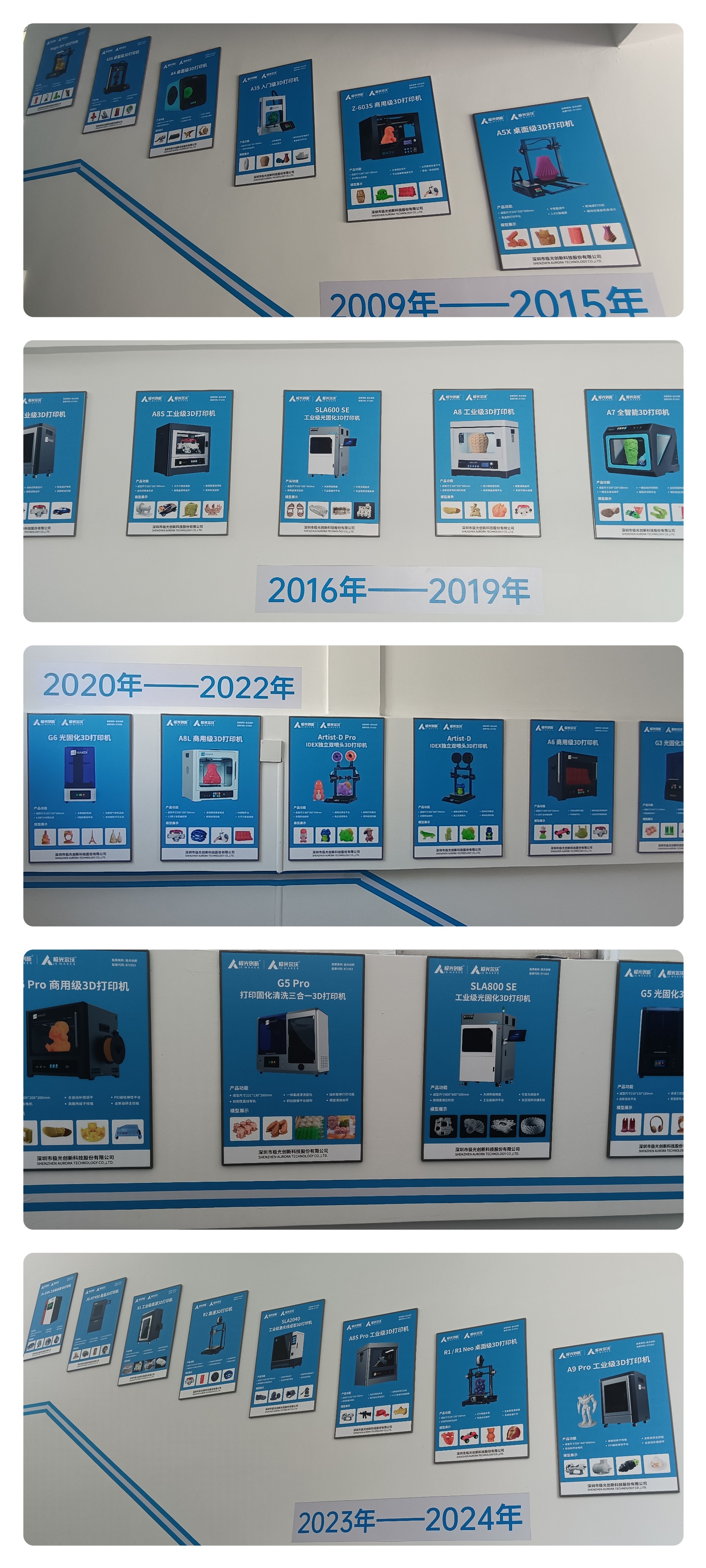 為了展現公司的發展歷程和輝煌成就,極光創新特意在入門處設置了產品展牌。從A5X到R2,從G3到G5 pro,從Z-603S到A8S,再到如今的工業級產品矩陣——SLA 2040、SLA 640、SLA 850、SLM 300等,每一款產品都是團隊努力的智慧結晶。這些展牌如同一部時光機,回顧著極光創新走過的每一步,帶領大家感受創新的力量。