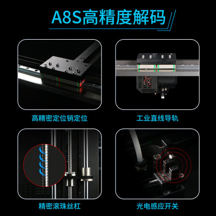 對于打印精度以及打印效果穩(wěn)定、機(jī)器運(yùn)行穩(wěn)定的雙穩(wěn)定上,A8S投入了十足的零件用料和技術(shù)投入。運(yùn)動組件、擠出組件、控制組件,在三大功能組件上都遵循了嚴(yán)格的質(zhì)量控制。