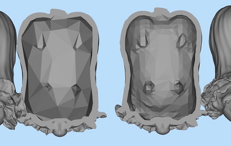基本上所有光固化切片軟件都支持掏空功能,不過不同軟件掏空算法可能有區別,掏空的內部形狀不一樣。如圖,左側是赤兔軟件掏空的內部情況,而右側則是用magics來掏空的。可以對比發現,總體上掏空內容差不多,但magics掏空后內表面更加簡化光滑。更簡潔的內表面意味著三角面更少,切片過程更快,減少電腦運行壓力,這個對于大量中間模型切片時效用很大。同時也因為較少出現復雜內表面,減輕了內部清理的難度。