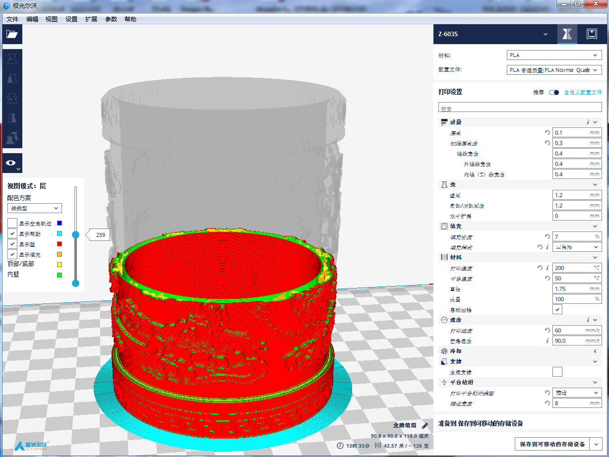 拖動分層預覽滾動條,軟件可以根據參數值,展現每一層的圖像。我們知道FDM打印技術原理,其實就是通過一層一層的材料堆積來實現整個模型的成型。通過預覽,你可以直觀地觀察到模型是怎樣一層一層生成的。